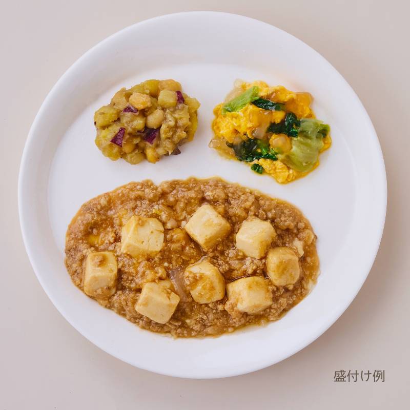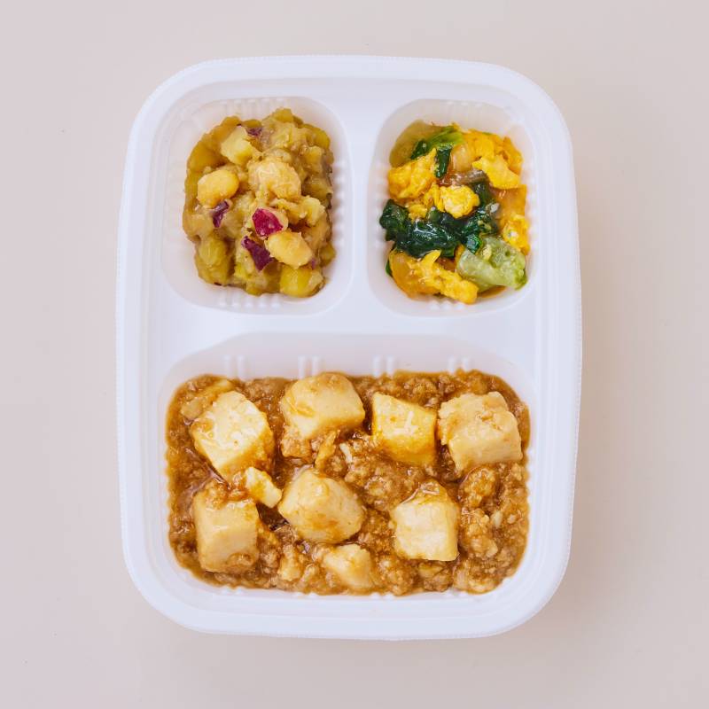 麻婆豆腐(豆腐(国内製造)、豚挽肉(ブラジル産)、玉ねぎ、酒、片栗粉、植物油、醤油、米みそ、豆みそ、トマトケチャップ、砂糖、中華だし調味料、刻みにんにく、生姜ペースト)、さつま芋と大豆の煮物(さつま芋(国産)、大豆(国産)、砂糖、醤油、みりん、炒りごま、片栗粉)、チンゲン菜と玉子の炒め物(チンゲン菜(国産)、液卵(全卵)、植物油、片栗粉、醤油、中華だし調味料、食塩)/凝固剤、(一部に小麦・卵・ごま・大豆・鶏肉・豚肉を含む)