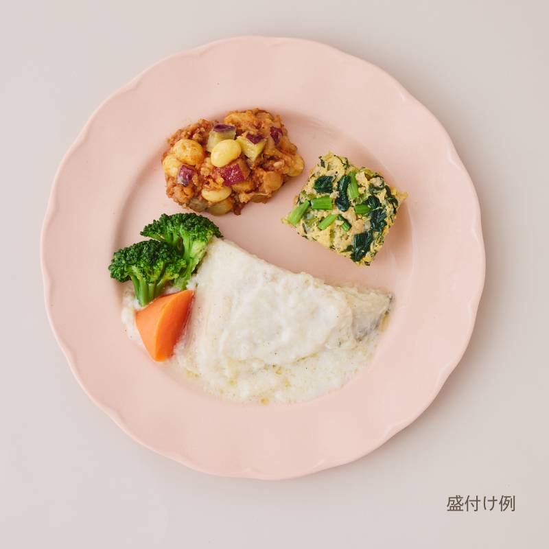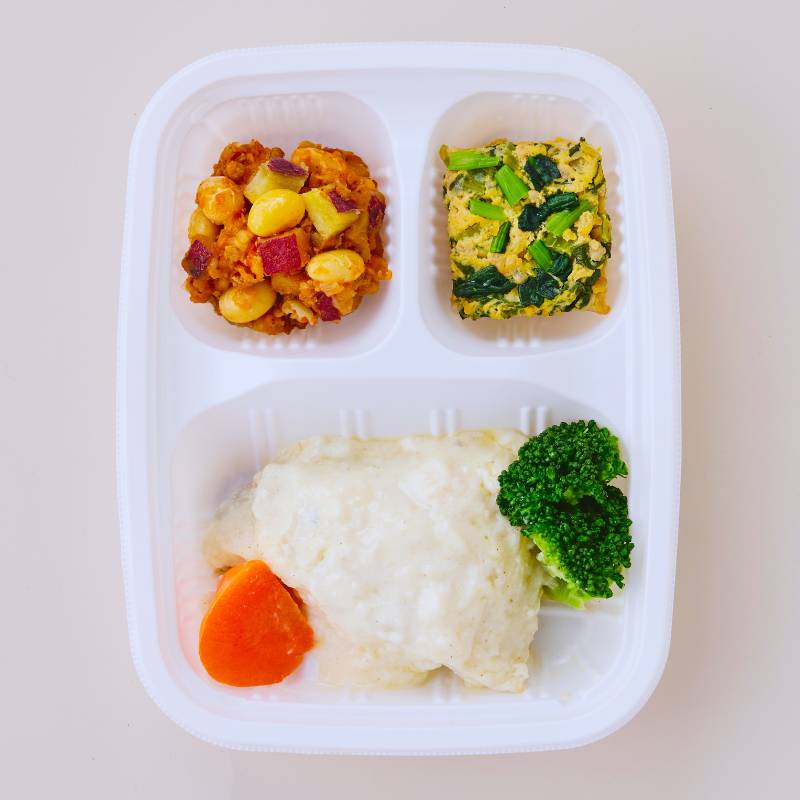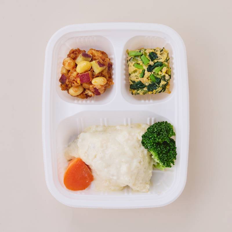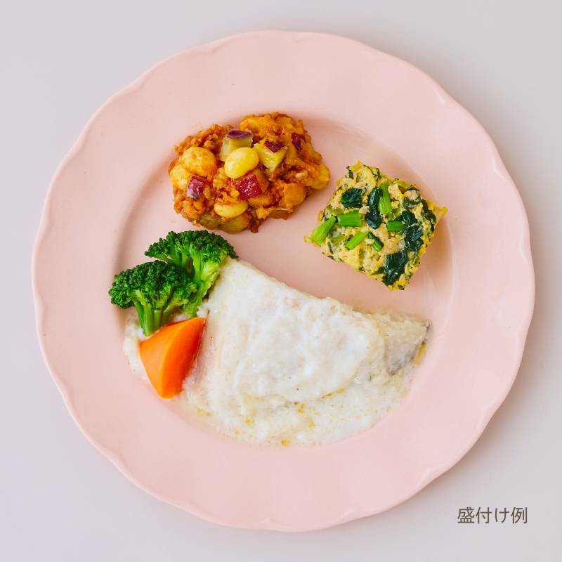 カレイのクリームソース煮(コガネガレイ(アメリカ産)、加工乳、ブロッコリー、玉ねぎ、人参、昆布たれ、植物油、小麦粉、バター、食塩、米みそ、コショウ)、小松菜とそぼろの卵焼き(液卵(全卵)、小松菜(国産)、豚挽肉、醤油、みりん、砂糖、酒、米みそ、大豆加工品、和風だしの素)、さつま芋のチリコンカン風(さつま芋(国産)、トマト・ピューレづけ、玉ねぎ、大豆、豚挽肉、トマトケチャップ、醤油、砂糖、植物油、中華だし調味料、おろしにんにく、赤唐辛子)、(一部に小麦・卵・乳成分・大豆・鶏肉・豚肉・ゼラチンを含む)