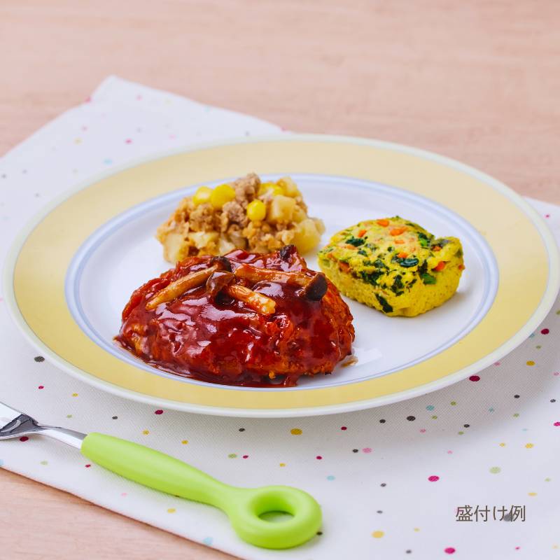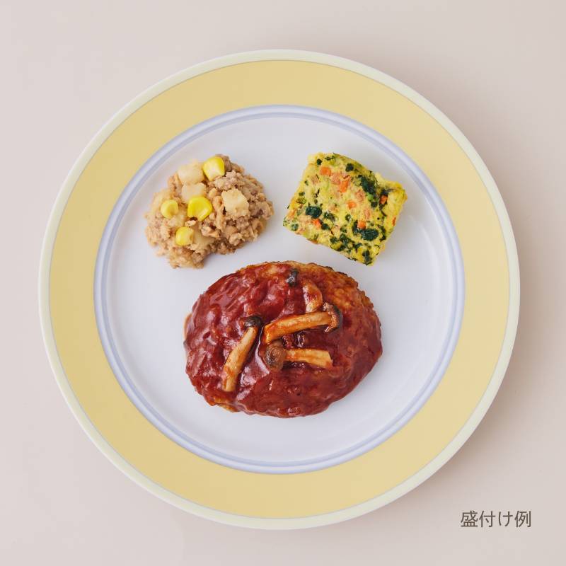 豚肉と大豆ミートを使ったハンバーグに、しめじ入りのコク深いデミグラスソースを合わせました。