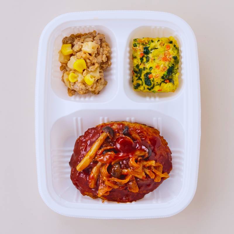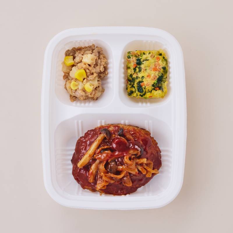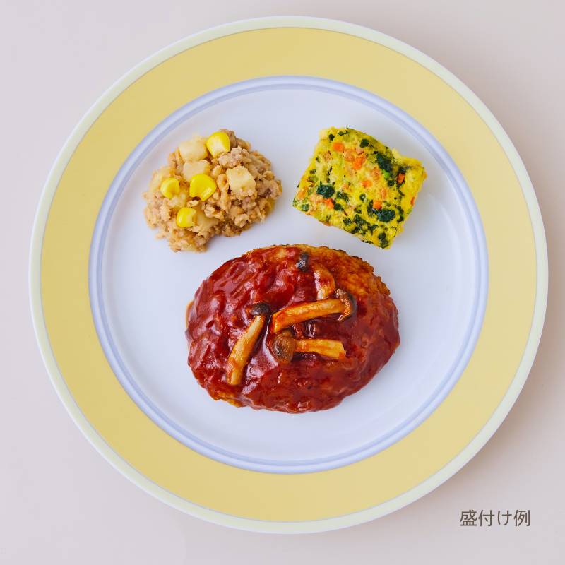 大豆ミート入りハンバーグしめじ入りデミグラスソース(大豆ミート入りハンバーグ(豚挽肉、加工乳、玉葱加工品、液卵(全卵)、パン粉、大豆加工品、食塩、ナツメグパウダー、コショウ)(国内製造)、玉葱、トマトケチャップ、ウスターソース、ぶなしめじ、バター、牛脂、米みそ)、野菜のオムレツ(液卵(全卵)、加工乳、小松菜、人参、玉葱加工品、バター、ナチュラルチーズ、食塩、コショウ)、じゃが芋バターそぼろがけ(じゃが芋(国産)、豚挽肉、大豆加工品、コーン、醤油、味醂、バター、砂糖、植物油、片栗粉)、(一部に小麦・卵・乳成分・牛肉・大豆・豚肉を含む)