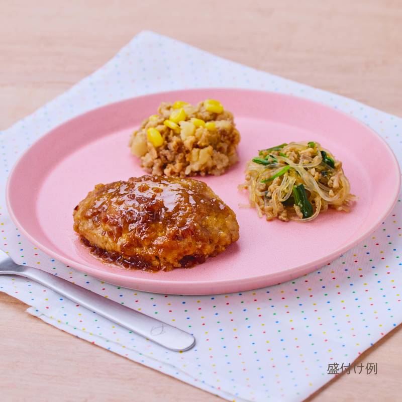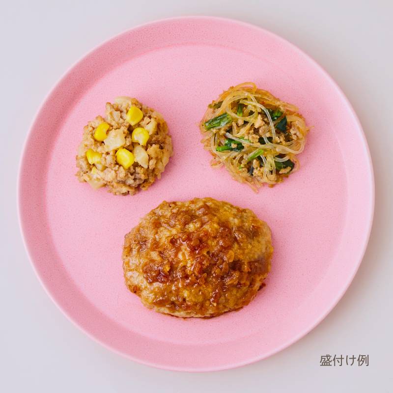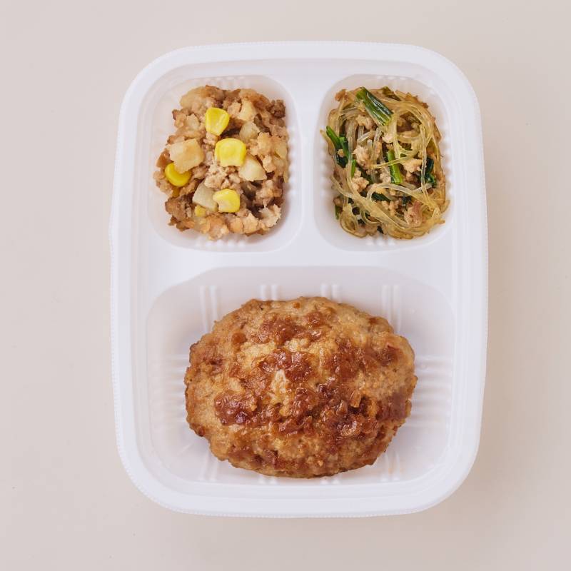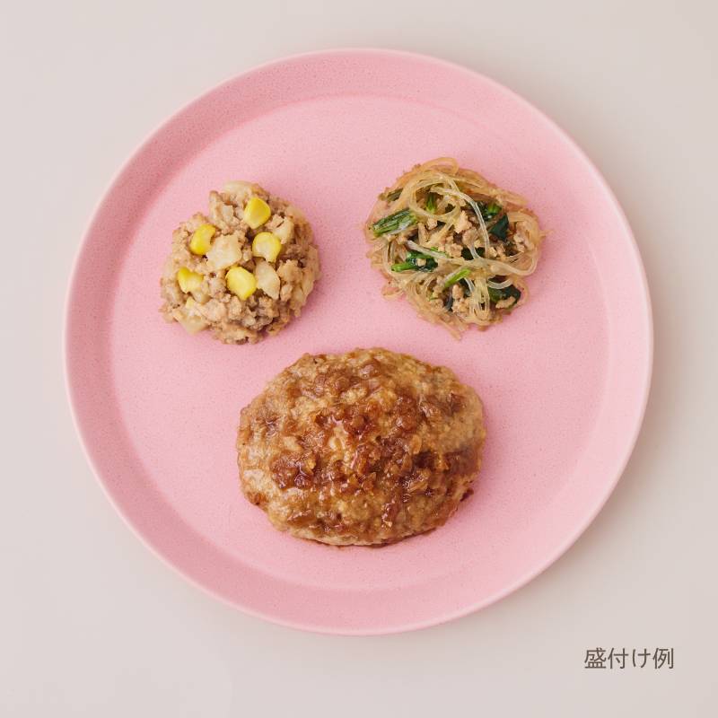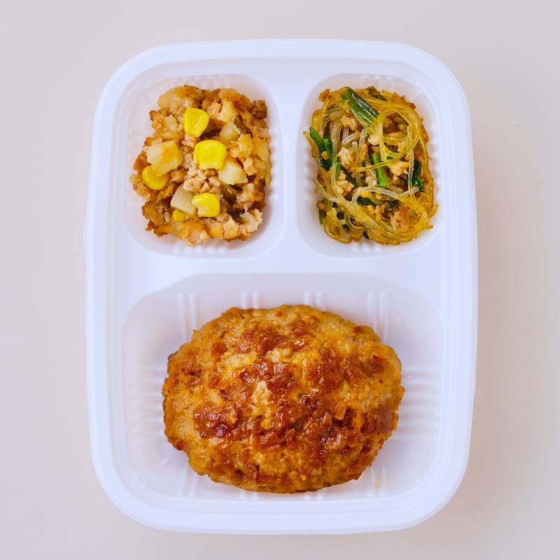 大豆ミート入りハンバーグオニオンソース(大豆ミート入りハンバーグ(豚挽肉、加工乳、玉葱加工品、液卵(全卵)、パン粉、大豆加工品、食塩、ナツメグパウダー、コショウ)(国内製造)、玉葱加工品、醤油、味醂、酒、バター、砂糖、牛脂)、春雨と小松菜と挽肉の煮物(緑豆春雨、小松菜(国産)、豚挽肉、味醂、醤油、砂糖、酒、片栗粉、植物油、すりごま、おろしにんにく)、じゃが芋バターそぼろがけ(じゃが芋(国産)、豚挽肉、大豆加工品、コーン、醤油、味醂、バター、砂糖、植物油、片栗粉)、(一部に小麦・卵・乳成分・牛肉・ごま・大豆・豚肉を含む)