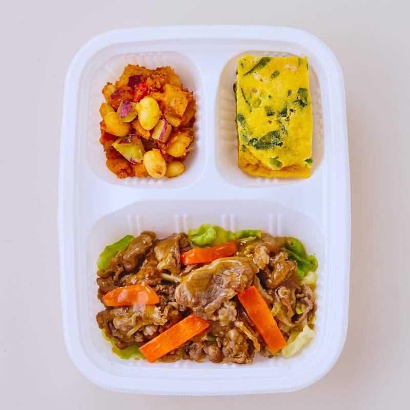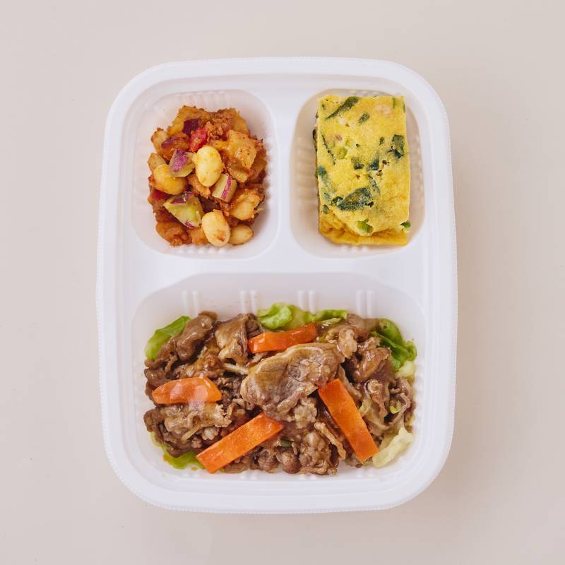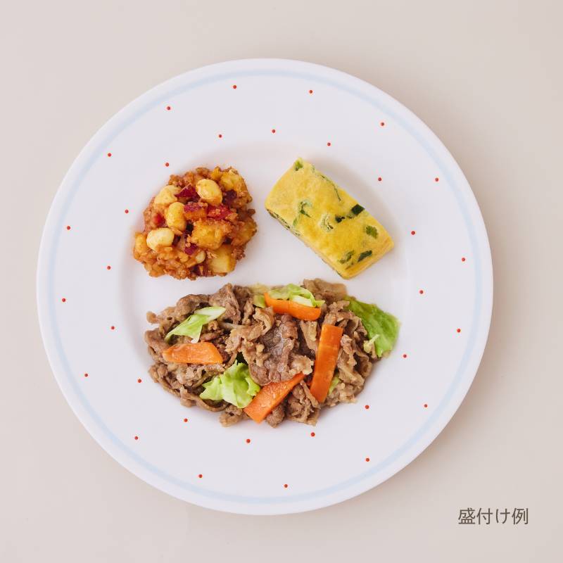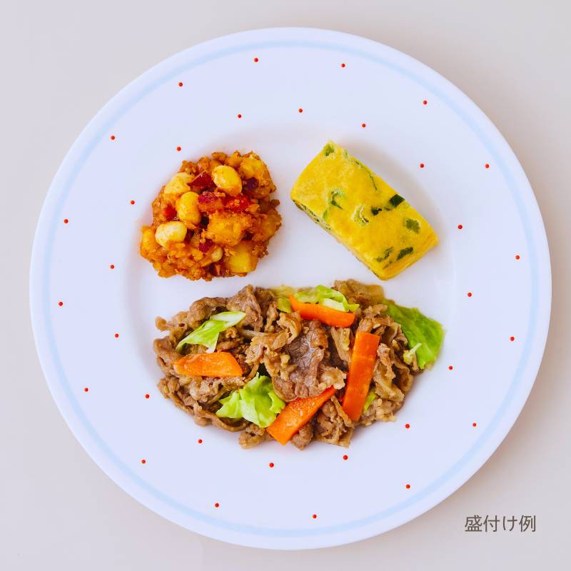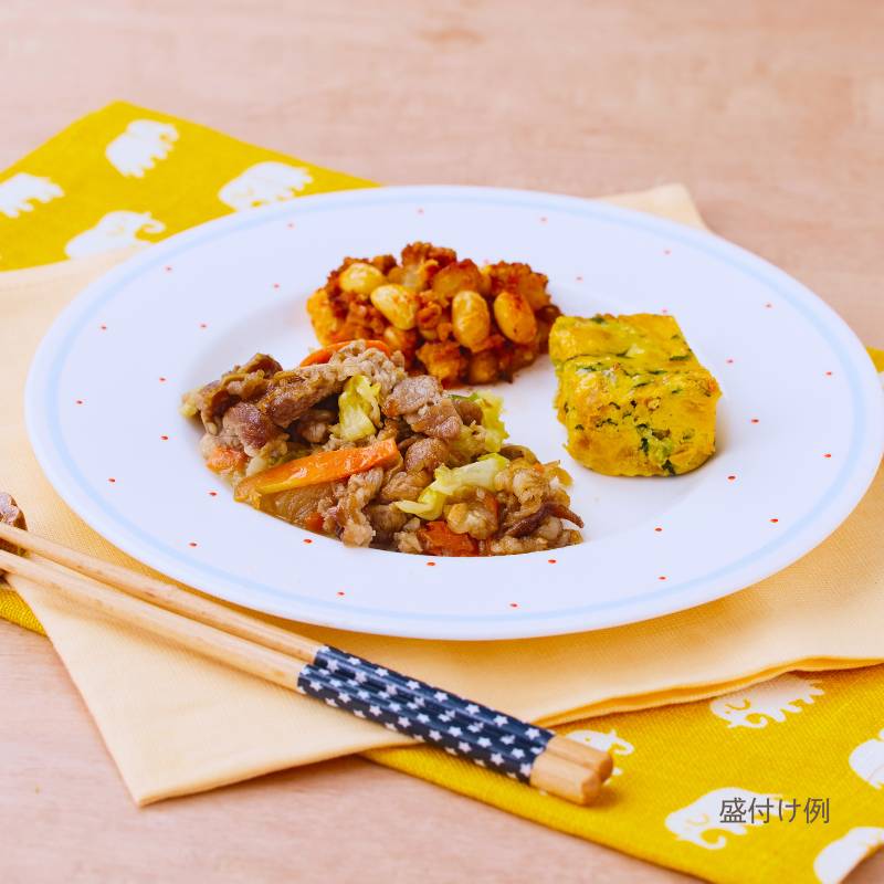 焼肉(牛肉(アメリカ産)、玉ねぎ、人参、昆布たれ、醤油、砂糖、米みそ、ウスターソース、植物油、炒りごま、みりん、片栗粉、りんご酢、刻みにんにく、生姜ペースト)、小松菜とそぼろの卵焼き(液卵(全卵)、小松菜(国産)、豚挽肉、醤油、みりん、砂糖、酒、米みそ、大豆加工品、和風だしの素)、さつま芋のチリコンカン風(さつま芋(国産)、トマト・ピューレづけ、玉ねぎ、大豆、豚挽肉、トマトケチャップ、醤油、砂糖、植物油、中華だし調味料、おろしにんにく、赤唐辛子)、キャベツの炒め物(キャベツ(国産)、植物油、コショウ、食塩)、(一部に小麦・卵・牛肉・ごま・大豆・鶏肉・豚肉・りんごを含む)