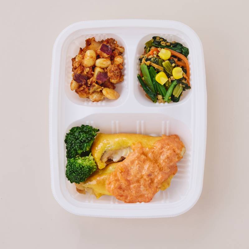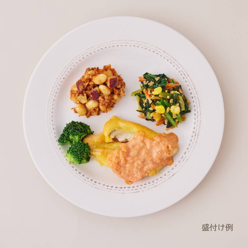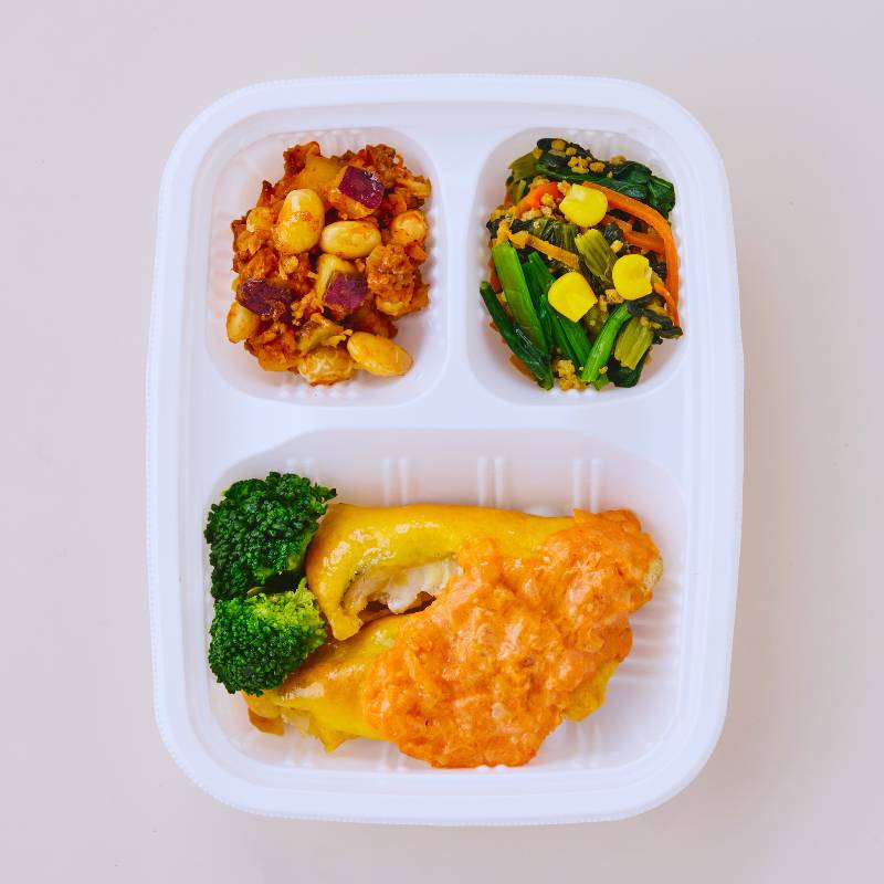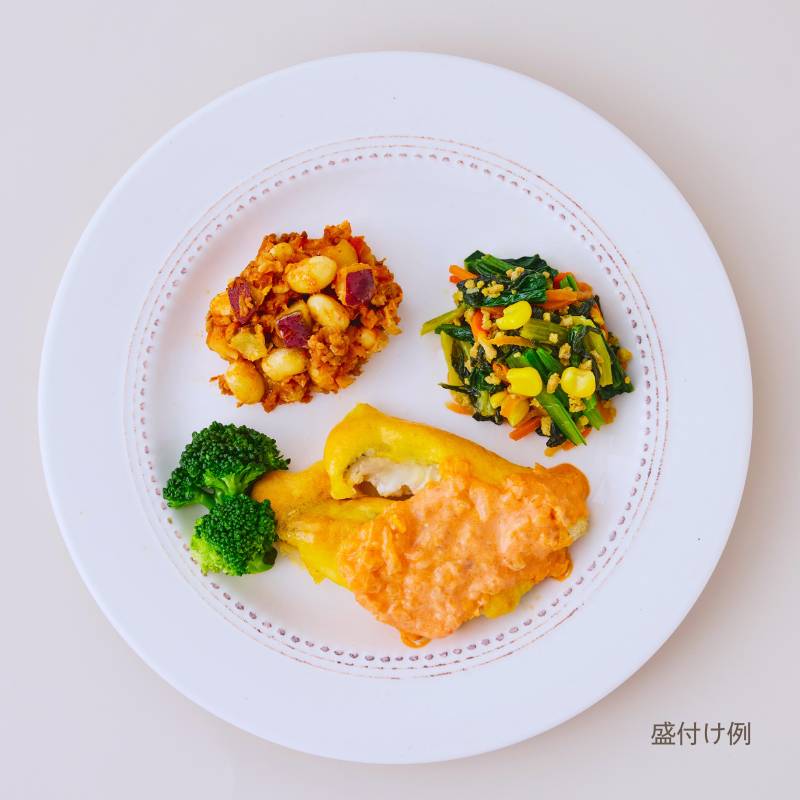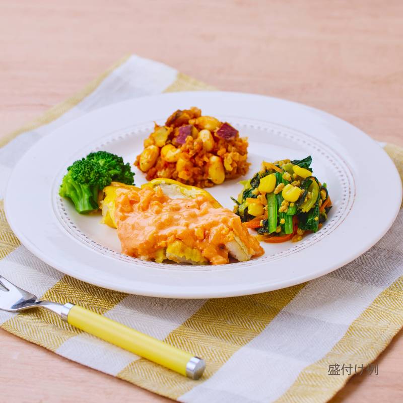 白身魚のピカタ風(スケトウダラ(ロシア産)、液卵(全卵)、ナチュラルチーズ、植物油、発酵乳、玉葱、小麦粉、トマトケチャップ、クリーム(乳製品)、米みそ、食塩、蜂蜜加工品(精製蜂蜜、蜂蜜、寒天))、サツマ芋のチリコンカン風(サツマ芋(国産)、トマト・ピューレづけ、玉葱、大豆、豚挽肉、トマトケチャップ、醤油、砂糖、植物油、中華だし調味料、オロシニンニク、チリ末、ナツメグ末)、小松菜の炒め物(小松菜(国産)、豚挽肉、人参、コーン、醤油、植物油、酒、食塩、クミン末、コリアンダー末、ウコン末)、ブロッコリー、(一部に小麦・卵・乳成分・大豆・鶏肉・豚肉を含む)
