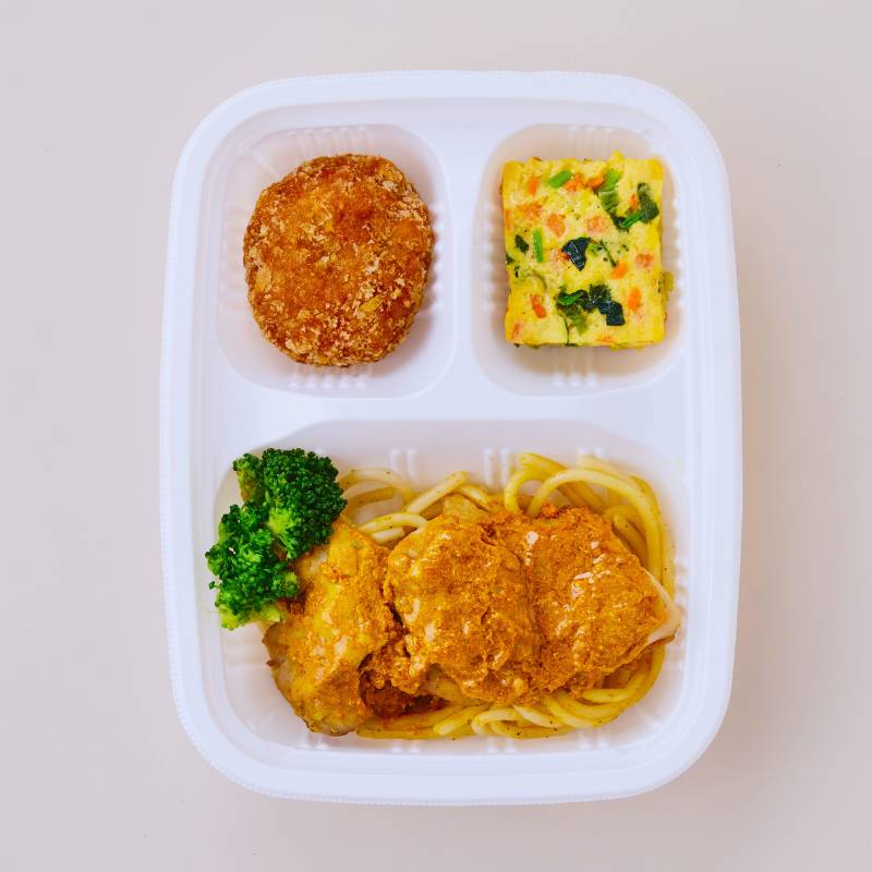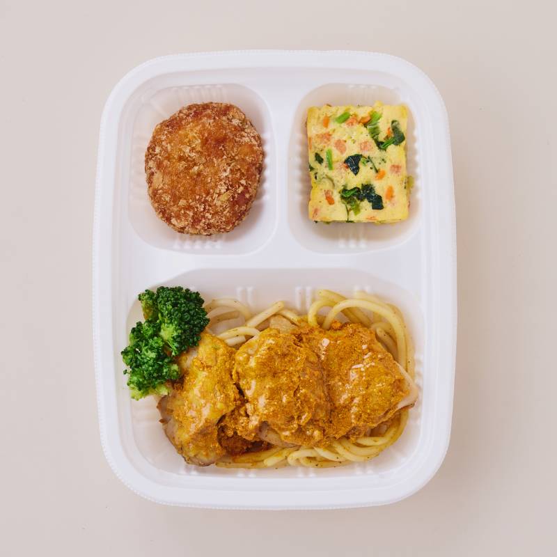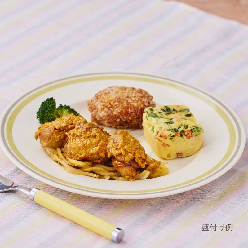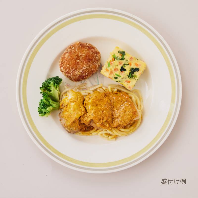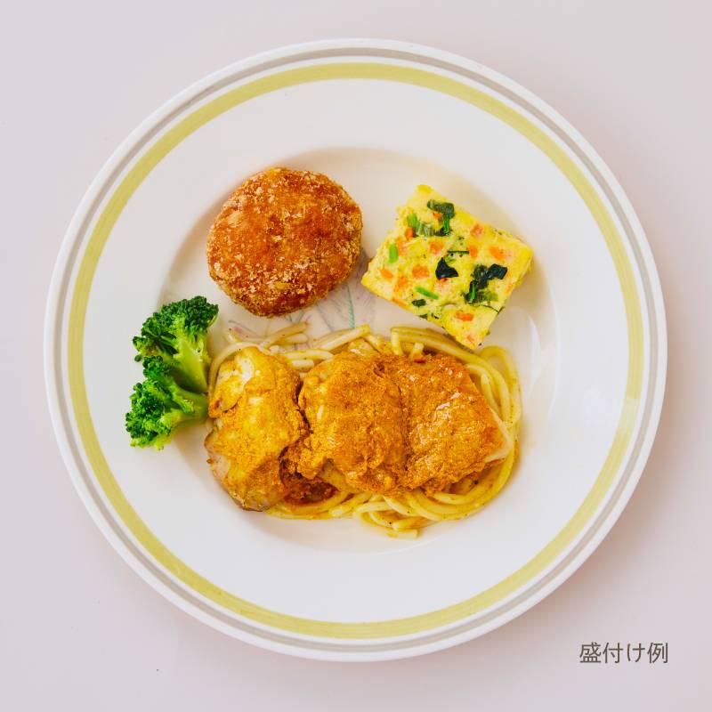 チキングリルのカレーソースがけ(鶏肉(ブラジル産)、はっ酵乳、昆布だれ、トマトケチャップ、植物油、食塩、カレー粉、蜂蜜加工品(精製蜂蜜、蜂蜜、寒天)、クミン、コリアンダーパウダー、ターメリックパウダー、おろしにんにく、おろし生姜、コショウ)、南瓜コロッケ(南瓜(国産)、パン粉、液卵(全卵)、植物油、小麦粉、ナチュラルチーズ、砂糖、炒りゴマ、食塩)、野菜のオムレツ(液卵(全卵)、加工乳、小松菜、人参、玉葱加工品、バター、ナチュラルチーズ、食塩、コショウ)、味付スパゲッティ(スパゲッティ、植物油、コショウ、食塩)、ブロッコリー、(一部に小麦・卵・乳成分・ごま・大豆・鶏肉を含む)
