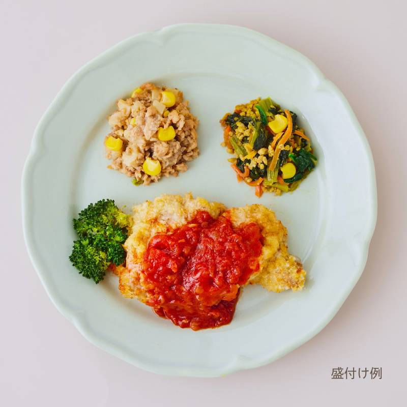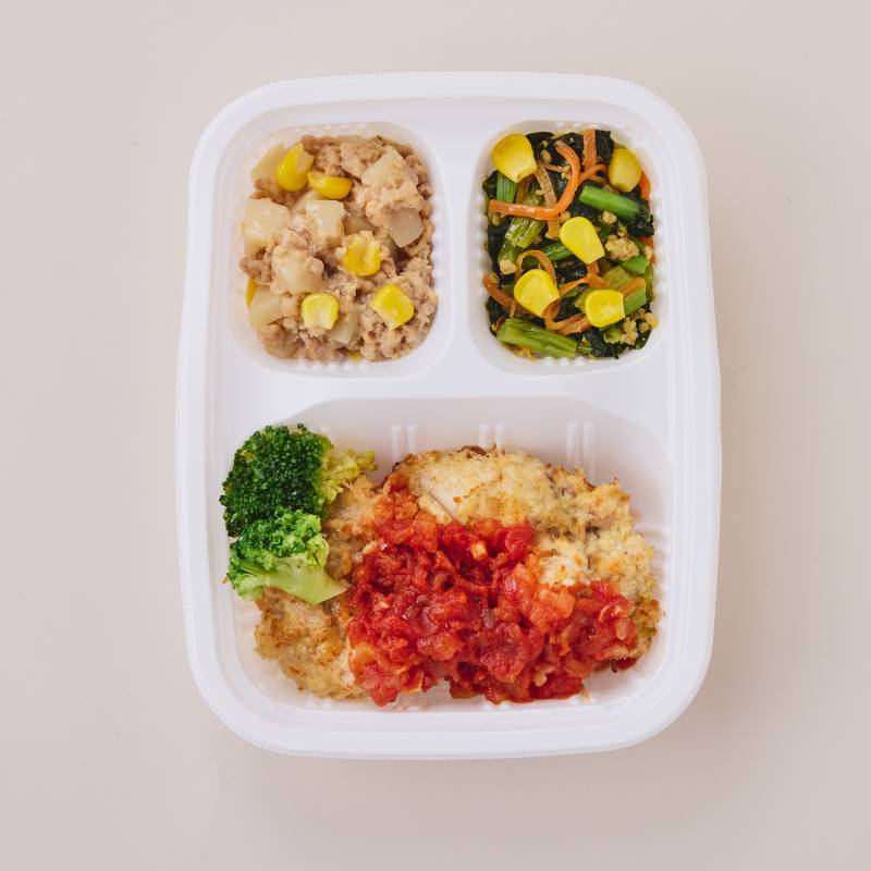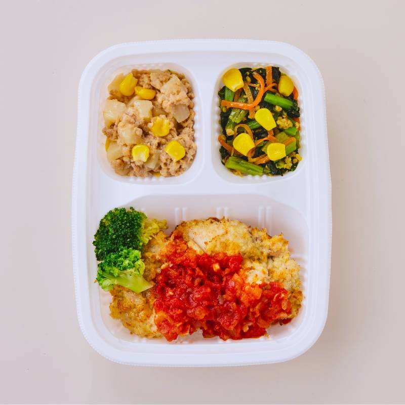 チキンカツトマトソース(鶏肉(タイ産)、トマト・ピューレづけ、玉ねぎ、液卵(全卵)、昆布たれ、パン粉、ナチュラルチーズ、小麦粉、植物油、トマトケチャップ、食塩、ウスターソース、刻みにんにく、コショウ)、小松菜と挽肉の炒め物(小松菜(国産)、豚挽肉、人参、コーン、醤油、植物油、酒、食塩、クミン、コリアンダーパウダー、ターメリックパウダー)、じゃが芋バターそぼろ(じゃが芋(国産)、豚挽肉、大豆加工品、コーン、醤油、みりん、バター、砂糖、植物油、片栗粉)、ブロッコリー、(一部に小麦・卵・乳成分・大豆・鶏肉・豚肉を含む)